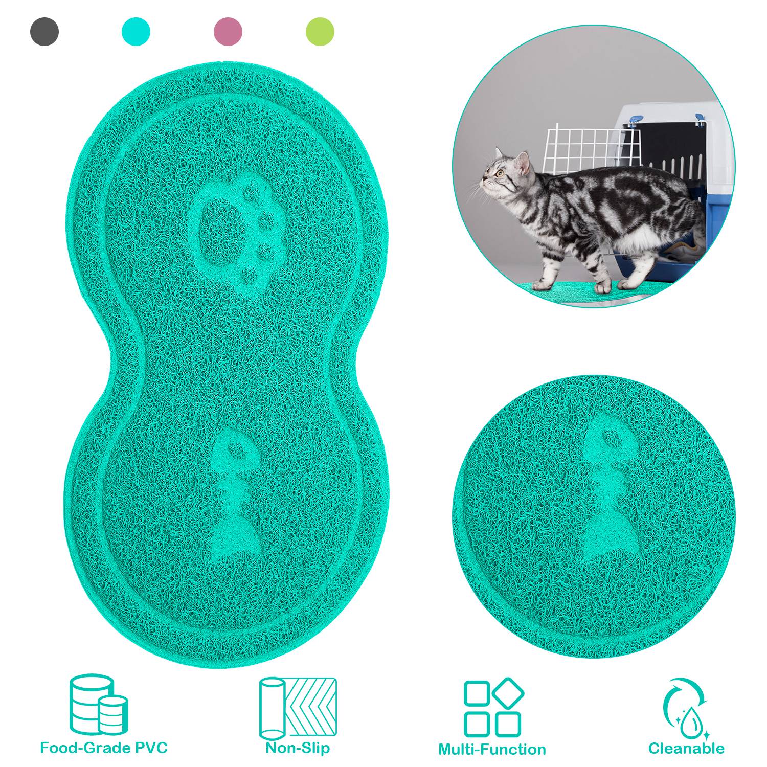 Our pet feeding mat adopts food-grade dense ring-shaped PVC fiber materials, non-toxic, soft, sturdy, durable, abrasion resistance and meantime, can grip the litters tightly to avoid any mess. Overspreading floor-friendly textures and suctions on its back, it is non-slip. It has multiple functions to be used as placemat, litter catcher mat, indoor or outdoor welcome mat, etc.