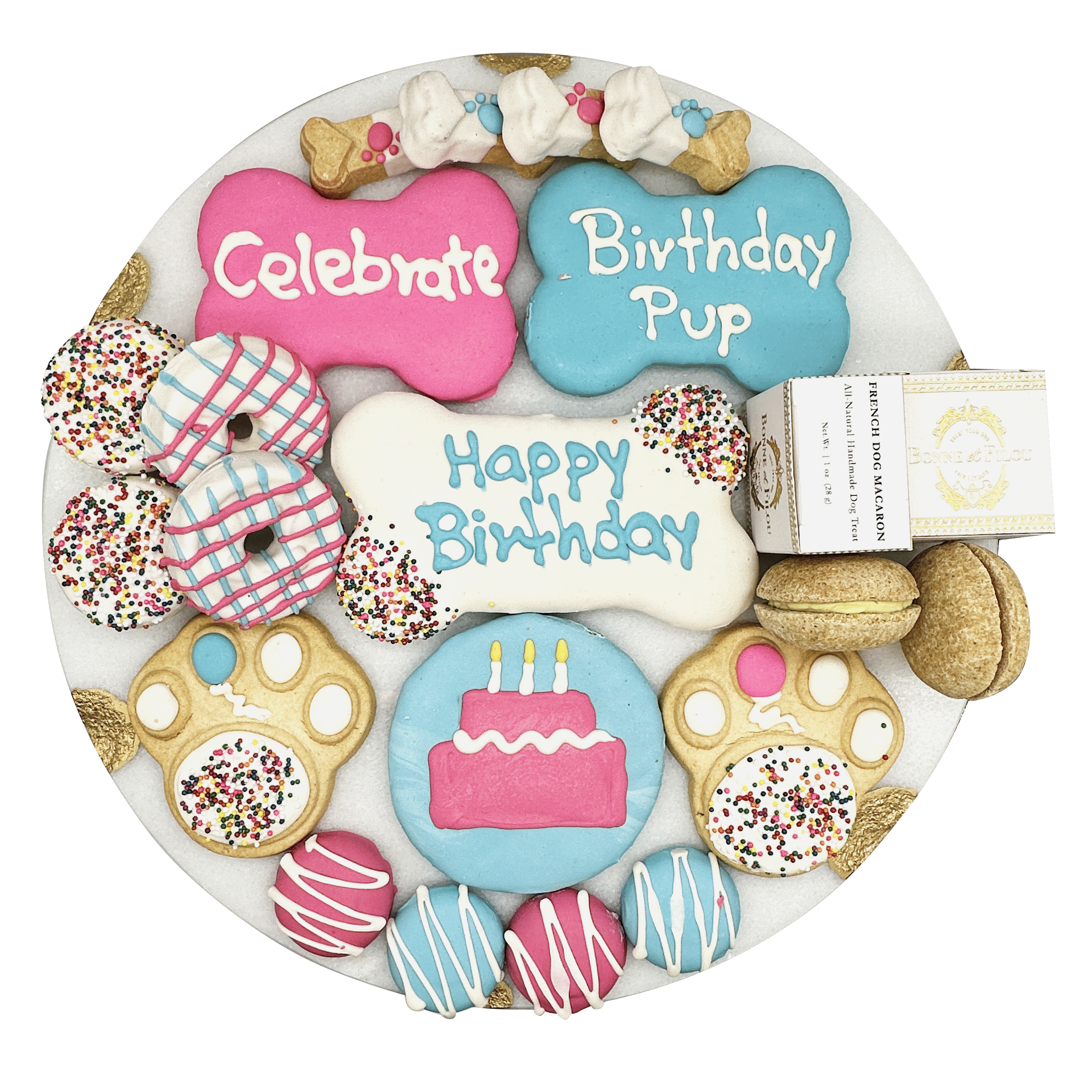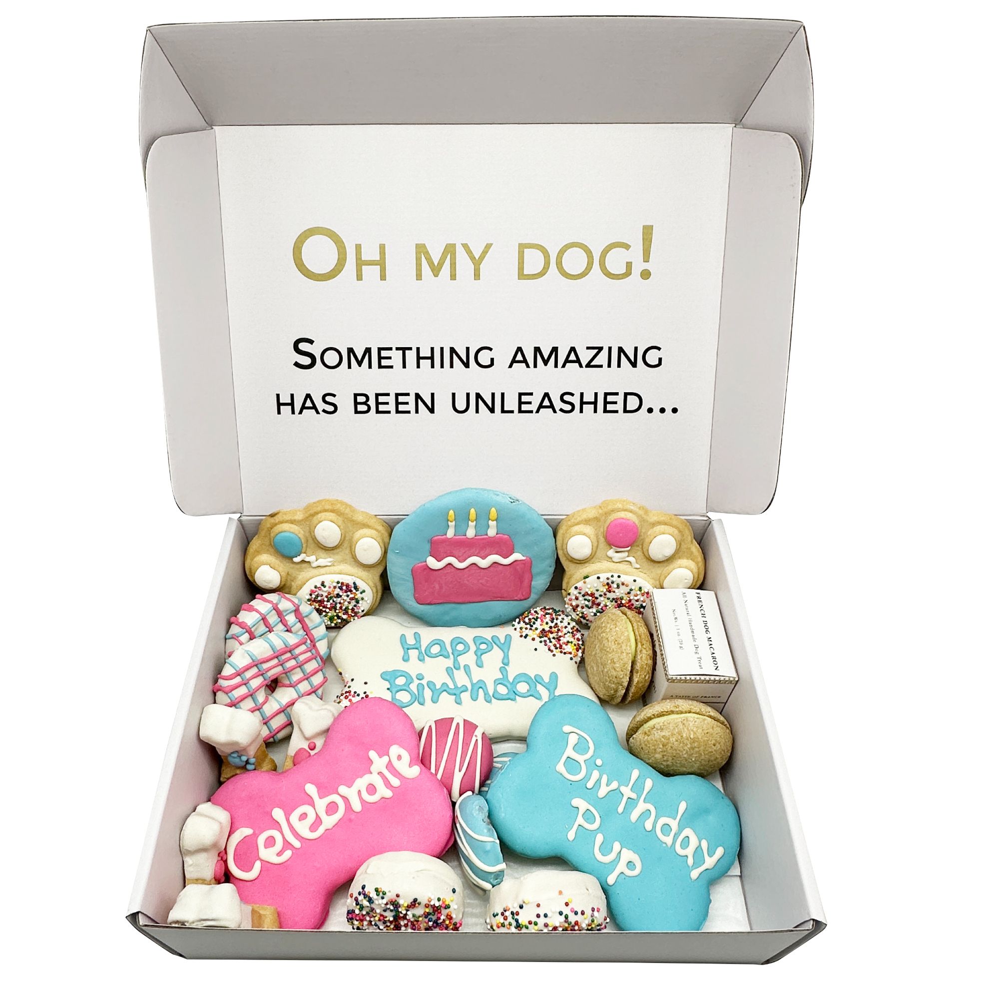 Spoil your Birthday Pup with a unique present guaranteed to please even the pickiest of pooches -, our luxury gift box filled with 20 delicious handmade birthday themed dog treats including dog macarons, crunchy dog bones, and cupcake-shaped treats.